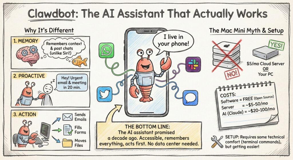 La gran diferencia con herramientas como ChatGPT o Claude es que Clawdbot no se limita a responder preguntas. Funciona como un agente: recuerda conversaciones pasadas, construye contexto con el tiempo y puede actuar de forma proactiva, avisándote de correos urgentes, reuniones próximas o cambios importantes que estás monitoreando. Además, hace tareas reales: envía correos, mueve archivos, controla el navegador o rellena formularios, todo a partir de instrucciones que le das por chat.