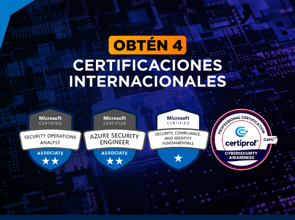 El programa se distingue por su enfoque práctico y orientado a certificaciones internacionales como SC-900, SC-200, AZ-500 de Microsoft y Security Awareness de CertiProf, utilizando laboratorios, entornos simulados y herramientas como Microsoft Sentinel, Defender for Cloud, DVWA y Kali Linux. De esta manera, el participante adquirirá tanto las competencias estratégicas como las habilidades técnicas necesarias para enfrentar y mitigar amenazas de ciberseguridad en escenarios empresariales modernos.