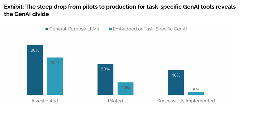 Paralelamente, en más del 90 % de estas empresas, los trabajadores utilizan de manera regular herramientas personales de IA —como ChatGPT o Copilot— para desempeñar sus tareas cotidianas. Esto configura, en la práctica, dos mundos paralelos: por un lado, un entorno “oficial”, compuesto por proyectos institucionales de IA de gran escala, pero con bajo nivel de adopción; y, por otro, un entorno informal en el que la IA se integra de forma orgánica al trabajo diario y contribuye de manera efectiva a mejorar la productividad individual y los resultados operativos.