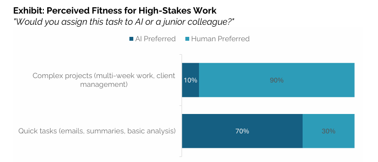 No obstante, cuando se trata de tareas complejas, críticas o de horizonte más largo, la preferencia se inclina claramente hacia las personas: en estos casos, los humanos siguen dominando por una relación de 9 a 1. Esto indica que, por ahora, la IA se percibe más como un complemento operativo que como un sustituto fiable del juicio y la experiencia humana en contextos de mayor exigencia.